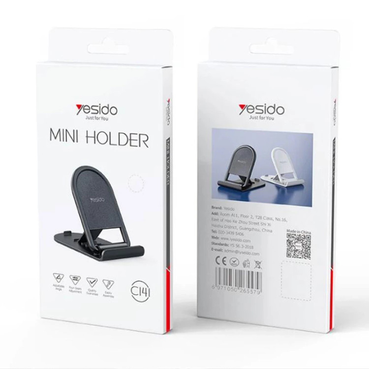 این هولدر رومیزی تاشو Yesido C۱۴۱ و کاملا قابل حمل است و با انواع گوشی های نسل جدید سازگار است. این محصول دارای استاندارد های جهانی CE ROHS FCC می باشد. این محصول در دورنگ سفید و مشکی عرضه شده است. وزن سبک و ابعاد کاملا قابل حمل این محصول شما را در استفاده هرچه راحت تر یاری میکند. وزن : ۳۵گرم ابعاد:۹.۳x۴.۹ سانتیمتر جنس بدنه : پلاستیک ABS + سیلیکون سازگار با انواع گوشی از ۳.۵ الی ۷ اینچ سبک و تاشو قابلیت تنظیم به زوایای مختلف برای دید بهتر دارای سیلیکون در قسمت انتهایی جهت ثبات بهتر برروی میز